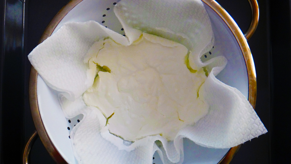 מרפדים מסננת גדולה בשתי שכבות של מגבת נייר רב-פעמית או בחיתול בד. יוצקים לתוכה את שני סוגי היוגורט ומערבבים. מכסים ומניחים, מעל קערה, ל- 3-5 שעות במקרר לניקוז הנוזלים.