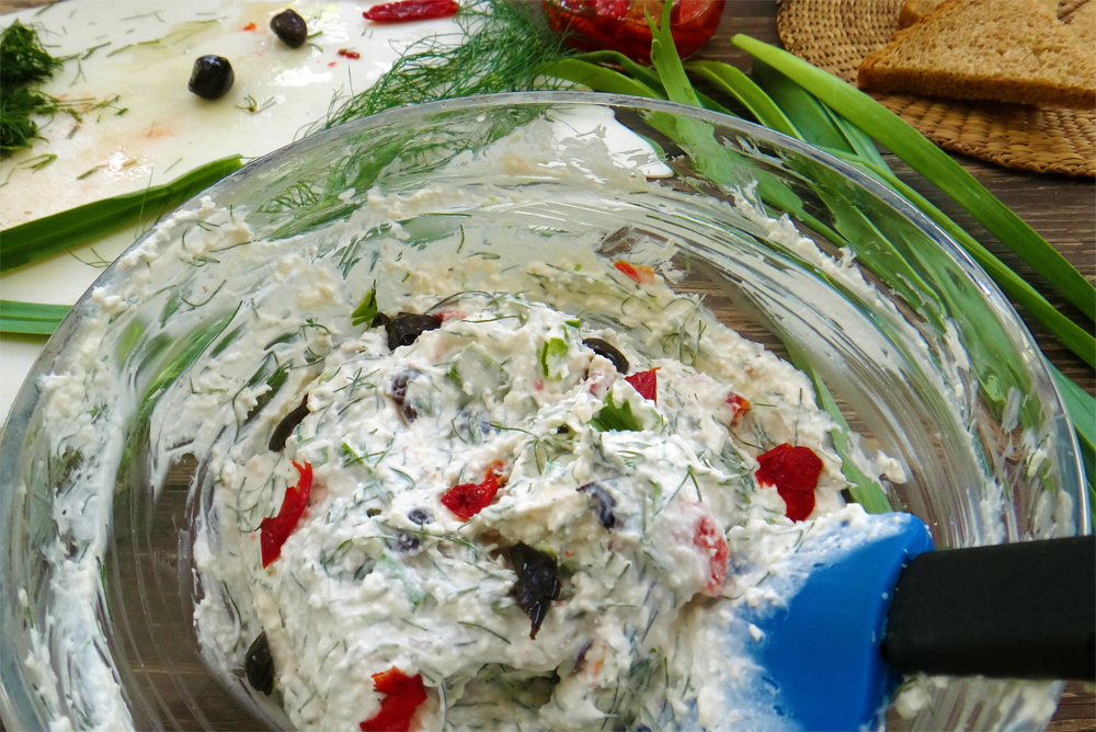 3. הכנת הממרח. את הגבינות המלוחות מגררים. את הגבינות הלבנות היבשות מועכים. שמים את כל הגבינות בקערה יחד עם שאר המרכיבים ומערבבים. אם התערובת פירורית מדי, מרככים עם יוגורט מסונן או גבינה לבנה. אם היא רכה מדי, מוסיפים עוד מהגבינות המוצקות. מוסיפים גם שמן זית לפי הטעם (עדיף מהשמן שבו מושרות העגבניות). מכניסים למקרר עד להגשה.