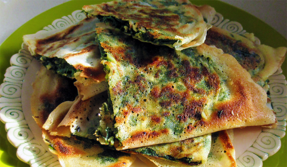 1. המלית. שמים כף שמן זית, בצל ירוק ושום במחבת רחבה ומאדים דקה על להבה נמוכה. מוסיפים את העלים ומקפיצים על להבה בינונית עד שהם מאבדים מנפחם. אם משתמשים בעלי מנגולד, מאדים עד שהנוזלים הנגרים מתאדים. מתבלים במלח (בהתאם למליחות הגבינה) ובפלפל ומעבירים לקערה. מוסיפים עשבי תיבול וגבינה ומערבבים היטב.