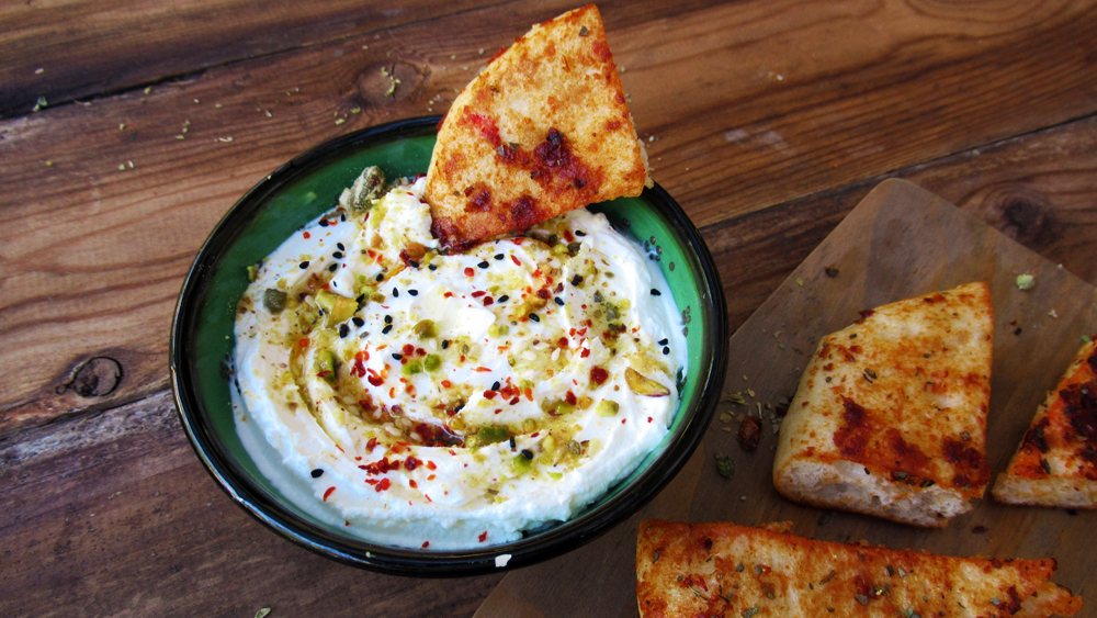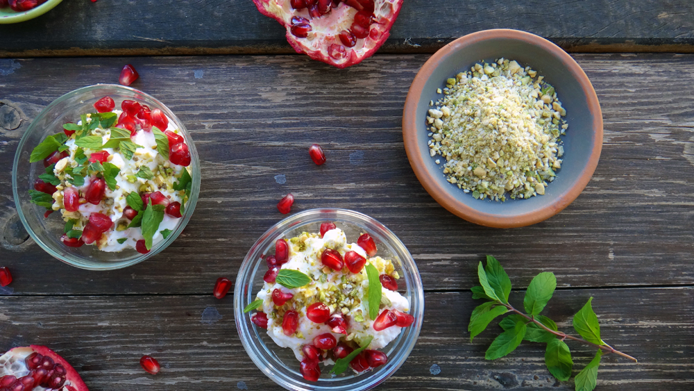 יוגורט מסונן. מוסיפים גרגרי רימון ועלי נענע. מגישים עם קרקרים, לחם קלוי, פיתות מחבת וכדומה.