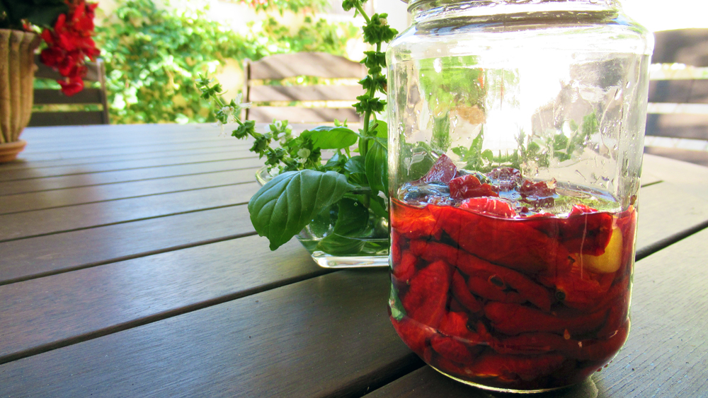 את העגבניות המיובשות אפשר לשמר גם בתערובת של שמן זית, שן שום וכמה עלי בזיליקום. מכניסים את כל המרכיבים לצנצנת ושומרים במקרר. משתמשים בעגבניות ובשמן במנות פסטה, בסלטים, בכריכים, בגבינות, ועוד.