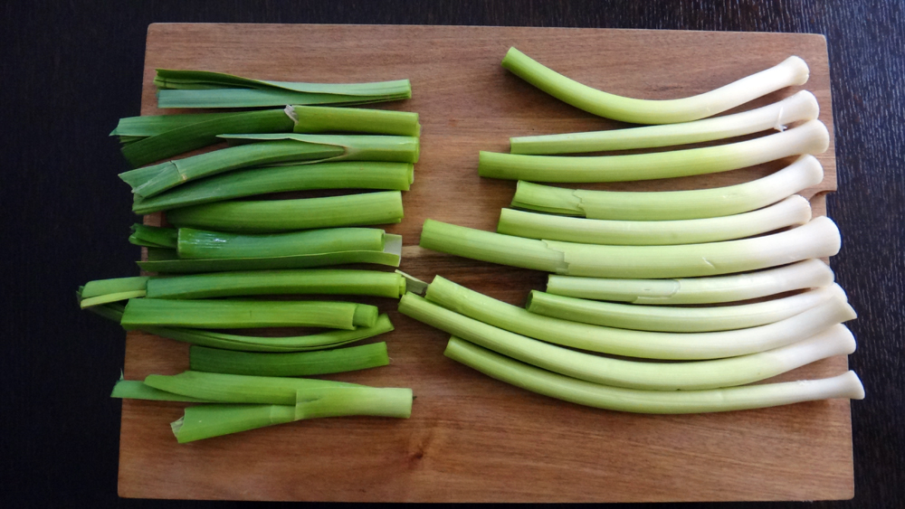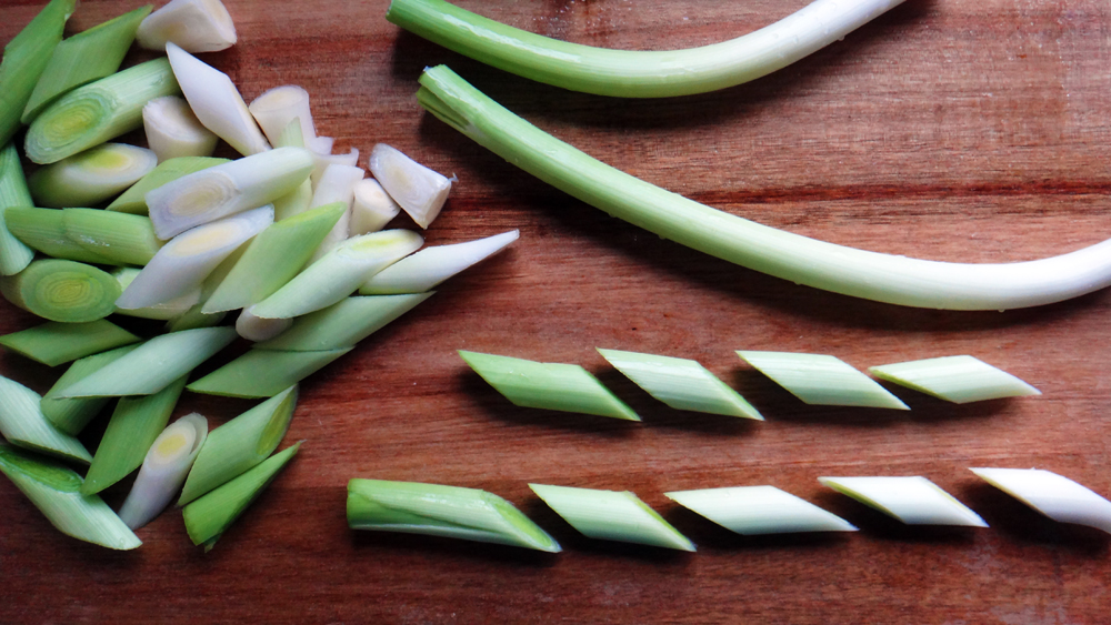 2. חותכים את החלק הלבן והירוק הבהיר למקטעים או פורסים לטבעות בהתאם להנחיות במתכון.