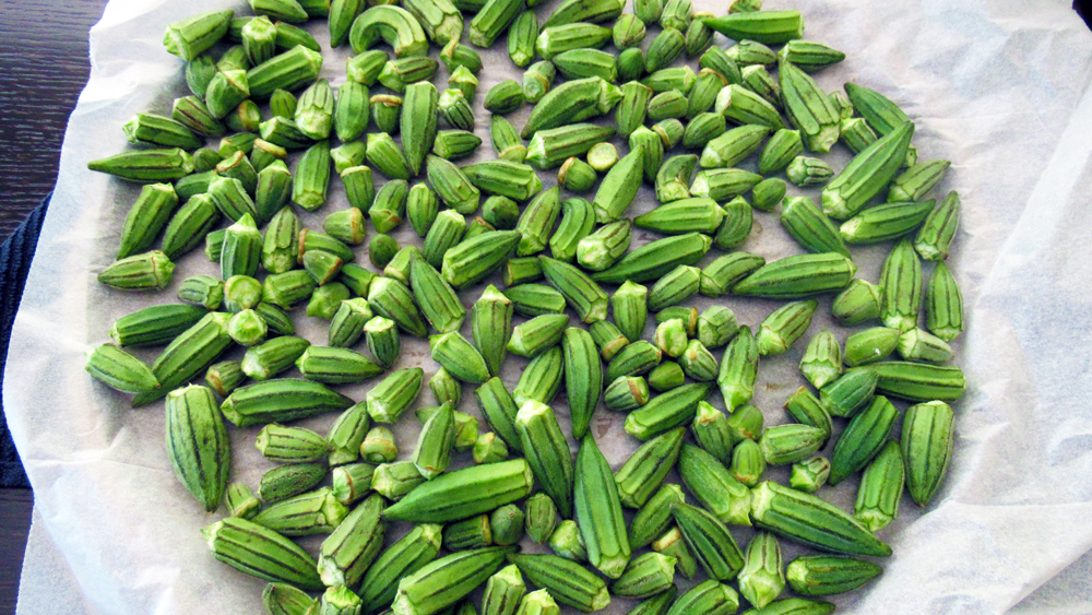 כאשר הבמיה רירית במיוחד (בדרך כלל בעיצומה של העונה), אני מיישמת את שיטת הייבוש הקר לפני הבישול: אחרי הטיפול במלח-חומץ, פורשים את התרמילים על נייר אפייה בשכבה אחת, מניחים על מגש בגודל מתאים למדף של מקרר. מכניסים למקרר למשך 24 שעות - תחליף פרקטי לשיטת הסבתות של ייבוש בשמש.