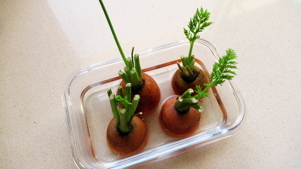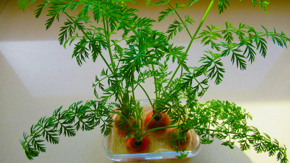 אפשר להצמיח עלים גם בתנאים ביתיים. אם ישנם עלים מחוברים, תסירו אותם ותשאירו כמה סנטימטרים של גבעולים. חתכו כ-3 ס"מ מהקצה העליון של הגזר והניחו אותו בכלי עם מעט מים במקום מואר או על אדן החלון. החליפו את המים מדי כמה ימים או קצת לפני שהם נגמרים. תוך שבוע תוכלו להבחין בעלים שצומחים מהקצה.